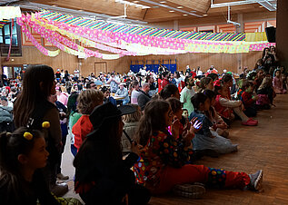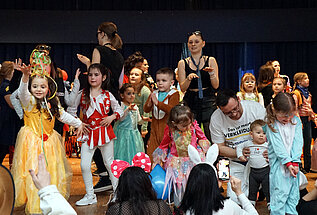 DJ Tom sorgte mit seiner bunten Lichtershow und vielen Faschingshits für ausgelassene Stimmung. Gemeinsame Tänze und eine große Polonaise mit den Eltern zu „Ich bin ein Pandabär“ oder „Die Hände zum Himmel“ bewiesen Feierlaune in der fünften Jahreszeit.